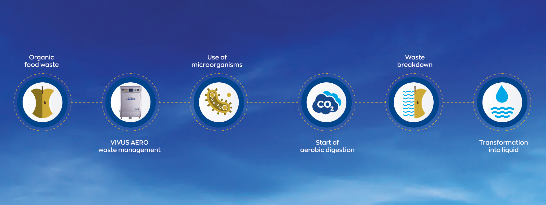 Vivus Aero uses an aerobic “digestion” process along with microorganisms to transform food waste into an environmentally friendly liquid that flows directly into the existing on-site sewage system.
